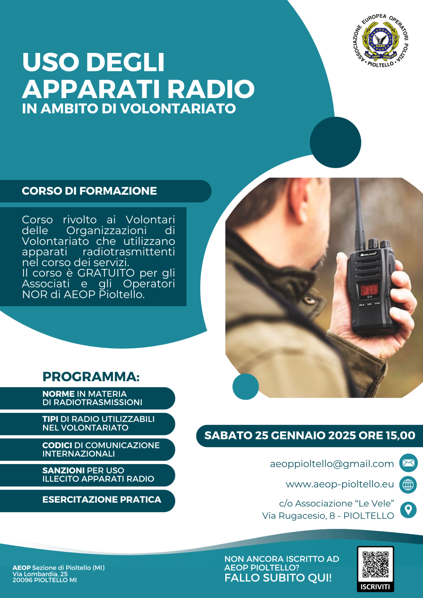 Il corso verterà su tutti gli aspetti teorici e pratici dell'uso delle radio, informando, formando e addestrando opportunamente i partecipanti con una esercitazione pratica nell'uso delle stesse.